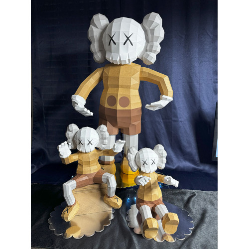 Own a stunning KAWS-inspired PaperCraft figurine featuring the iconic character holding two children, all dressed in matching outfits. This handcrafted piece captures the emotion and signature style of KAWS, blending fine craftsmanship with modern design.